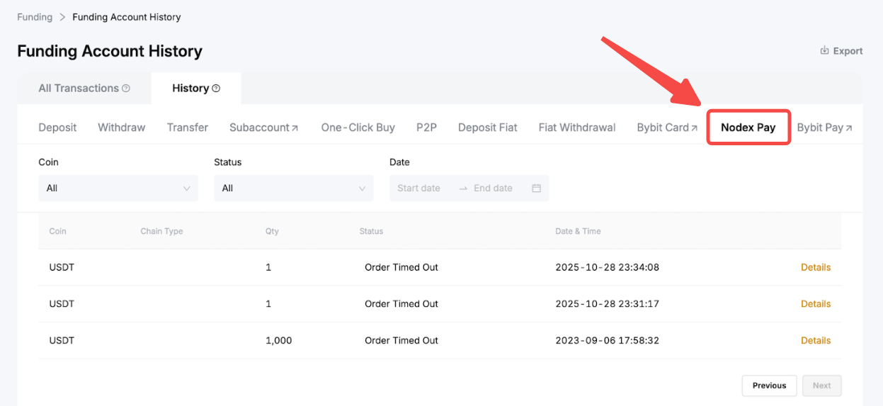 Step 5: Once the transaction is completed, you may view the order record on the Funding Account History page. To view Nodex Pay records only, simply click on Nodex Pay.