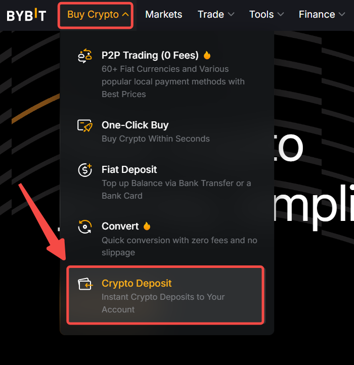 Alternatively, you may also hover your cursor over Assets at the top right-hand corner of the Bybit homepage. Then, click on Deposit to enter the deposit page.