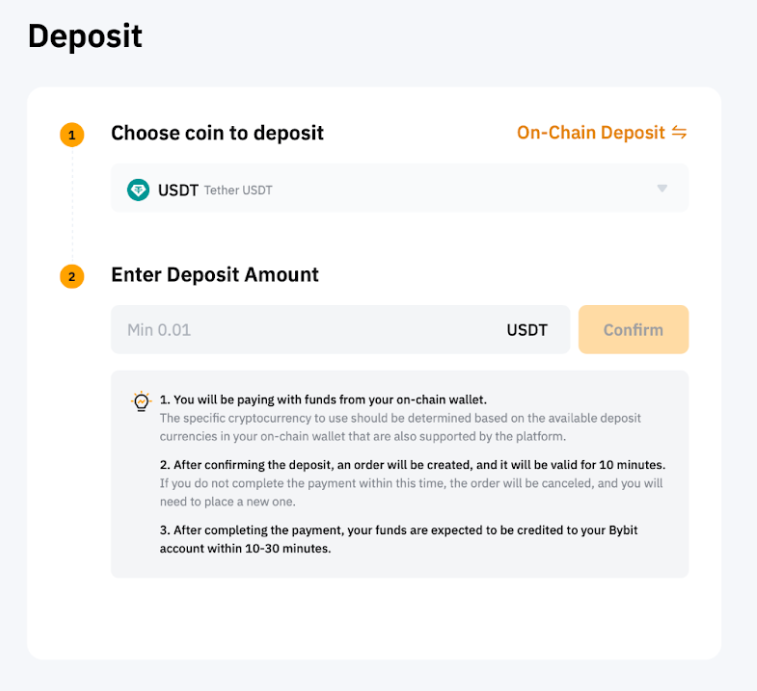 Crypto deposit via Nodex Pay is available for all Bybit users, enabling deposits in USDT via ERC20, BSC, and MATIC networks.